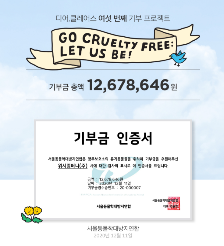 The proceeds from sales totaled to 6,339,323 won, and Dear, Klairs has contributed the same amount making it a grand total of 12,678,646 won, which was donated to the “Seoul Alliance for Prevention of Cruelty to Animal”. The Seoul Alliance for Prevention of Cruelty to Animal is an organization that yearns for people⬝animals⬝nature to come in harmony and takes the lead in animal protection. The contributions are anticipated to be used for the rescuing and treatment of abused animals and the cost of purchasing supplies for the cold winter.