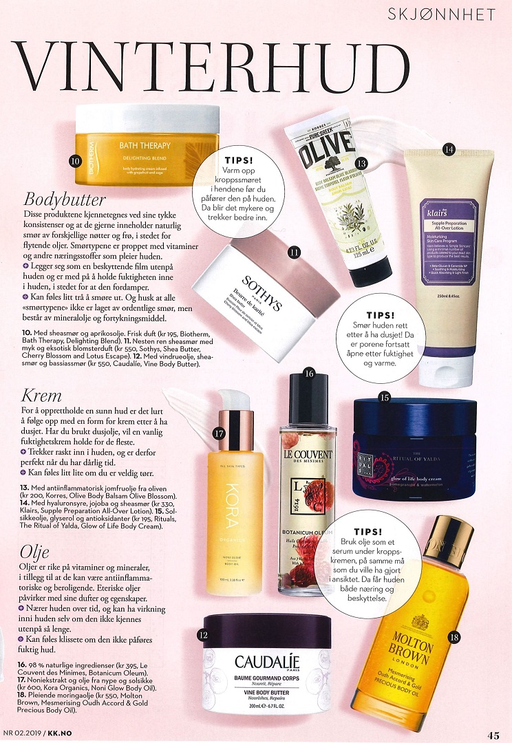 Norwegian Fashion and Beauty magazine, KK, has featured Klairs Supple Preparation All-Over Lotion. The All-Over Lotion can be used anywhere on the face and body wherever moisture is needed. It absorbs quickly without leaving the skin sticky or greasy which makes it usable all throughout the year, in any season. Formulated with only the mild ingredients, sensitive skin can easily apply on the entire body, face and even hair!